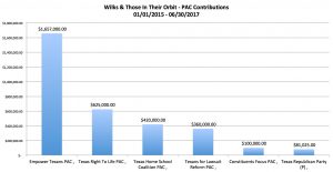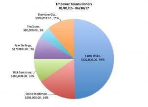 Digging through the campaign finance data, I realized that Empower Texans wasn’t the only PAC getting money from the Wilkses. From Jan. 1, 2015, through June 30, 2017, the Wilks family looks to have given $3,345,734 for political causes, which does not include the $15 million they gave to a Ted Cruz for President PAC. There are three PACs getting a large portion of those dollars: