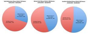 For example, take HD 73 Rep. Kyle Biederman, who received 30 percent of his campaign contributions since 2015 from the Wilkses and their orbit. Seems like a lot of influence, but it there is still 70% of his campaign funding coming from elsewhere. Compare that to HD 128, where 44 percent of Rep. Briscoe Cain’s campaign contributions came from the Wilkses & their orbit. In HD 92, Rep. Jonathan Stickland has broken the 50 percent threshold, with 53 percent of his donations coming from this group of people.