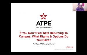 This week, ATPE hosted its second free legal webcast on COVID-19 issues facing school employees. In the presentation ATPE Managing Attorney Paul Tapp gives an overview of available accommodations under the Americans with Disabilities Act, paid and unpaid leave options, and more. Find the latest webcast here. To watch our first legal webinar on educators' rights and COVID-19, click here.