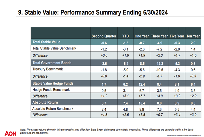 The Policy Committee reported on making targeted modifications based on Investment Committee discussions and recommendations made by fiduciary counsel and advisors. The Policy Committee also purposed policy modifications that reflect changes to the organizational structure within benefit services, as well as updates to the annual policy review schedule.