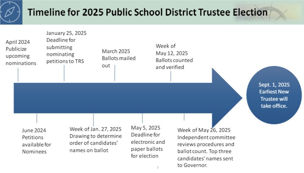 The board was also informed that TRS is now accepting nominations for eligible members to qualify as candidates for the election of the at-large and retiree positions on the TRS Board of Trustees. While TRS board members are gubernatorial appointees, active and retired educators vote to send a slate of three candidates to the governor. The governor must choose from within the slate he is sent to fill the board seats that are required to held by active and retired educators. Both terms begin as early as Sept. 1, 2023, and end Aug. 31, 2029.