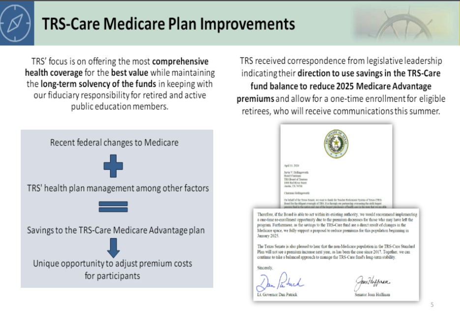 Below is the TRS slide detailing the information regarding plan improvements. For more information, visit the TRS-Care Medicare Advantage webpage.